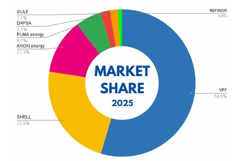 En este contexto, YPF volvió a terminar el año como líder del mercado por amplio margen, capturando el 54,6%, seguida por Shell (22,9%), Axion Energy (12,1%), Puma Energy (5,7%), DAPSA (2,1%), Gulf (1,7%) y Refinor (0,9%).