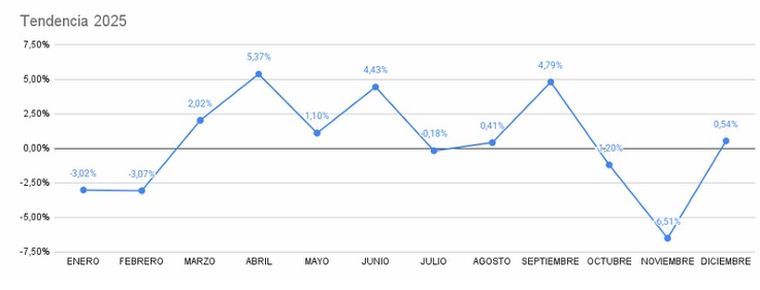 En ese sentido, el 2025 sigue casi al pie de la letra esta lógica infalible. El relevamiento de Surtidores, el portal de las estaciones de servicio, destaca que en diciembre la venta de combustibles al público volvió a crecer en términos interanuales, comercializándose 1.503.859 m³, lo que supone una expansión de 0,54% en relación al volumen de 1.495.855,08 m³ registrado en diciembre de 2024 y luego de dos meses de caída en octubre y noviembre.