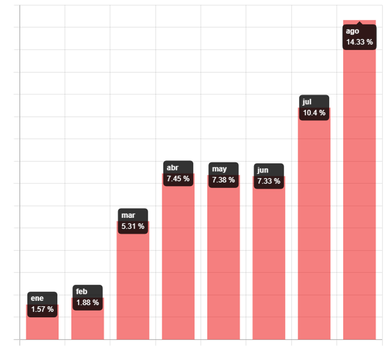 Además de ser el segundo mes consecutivo de incremento, agosto también fue la suba más alta en lo que va del año. Más allá del amesetamiento de junio y mayo, el único incremento a la altura se registró en marzo cuando fue del 3.36%. Los restantes en orden fueron abril (2.04%), junio con el 2.86% mencionado, enero (1.57%) y febrero (0.31%).