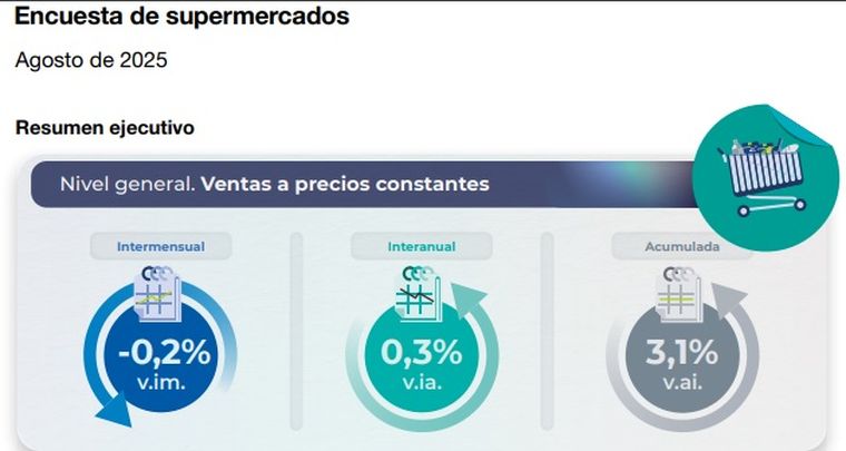 En el caso de los supermercados, el índice de ventas totales a precios constantes mostró un aumento de 0,3% interanual. Lo que implica una fuerte desaceleración de los que sucedió en los primeros meses de 2025. En el acumulado enero-agosto de 2025 hubo una variación creciente de 3,1% respecto a igual periodo de 2024.