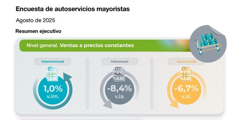 En agosto de 2025, el Índice de ventas totales a precios constantes muestra una disminución de 8,4% respecto a igual mes de 2024. El acumulado enero-agosto de 2025 registra una caída de 6,7% respecto a igual período de 2024.