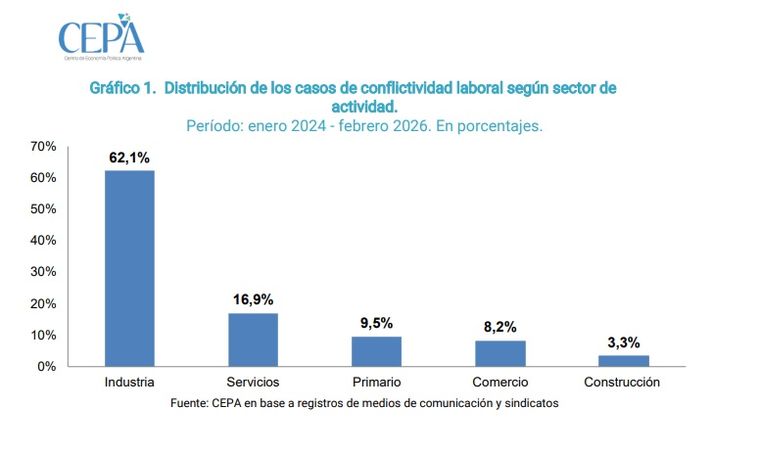 El relevamiento muestra que el 62,1% de los conflictos se concentró en el sector industrial, lo que lo convierte en el más afectado durante el período analizado. Dentro de este universo, las ramas textil, alimenticia y metalúrgica-siderúrgica encabezan la lista.