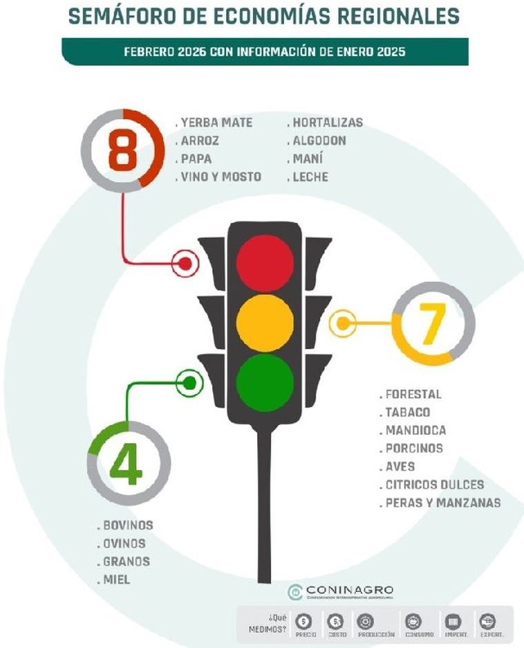 Cabe acotar que el semáforo de esta institución analiza tres componentes: negocio, productivo y mercado. El primero evalúa la evolución del precio y el costo, tanto mensual como interanual. El segundo mide el área o stock, según corresponda, y la producción. Y el último, la evolución de las exportaciones y las importaciones de las producciones, así como el consumo interno.