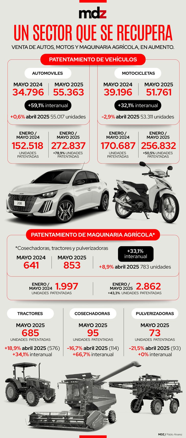 Por otro lado, la misma entidad aseguró que el número de motos patentadas durante mayo de 2025 fue de 51.761 motovehículos, esto es una suba interanual del 32,1% ya que en mayo de 2024 se habían registrado 39.196 unidades.