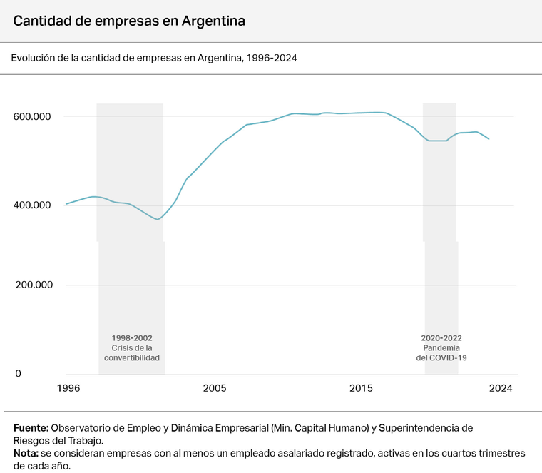La densidad empresarial en Argentina hoy es igual que hace 30 años. En 1996 había 11,9 empresas cada 1000 habitantes, el mismo número que en 2024. Sin embargo, hubo algunos períodos de crecimiento y otros de contracción, que en general acompañaron los ciclos económicos. De acuerdo con un estudio del ex Ministerio de Desarrollo Productivo, en el largo plazo se evidencia que cuando la economía argentina crece 1%, las empresas lo hacen en 0,5%. Esto significa que cada punto del PIB está asociado a la creación de unas 2.800 empresas.