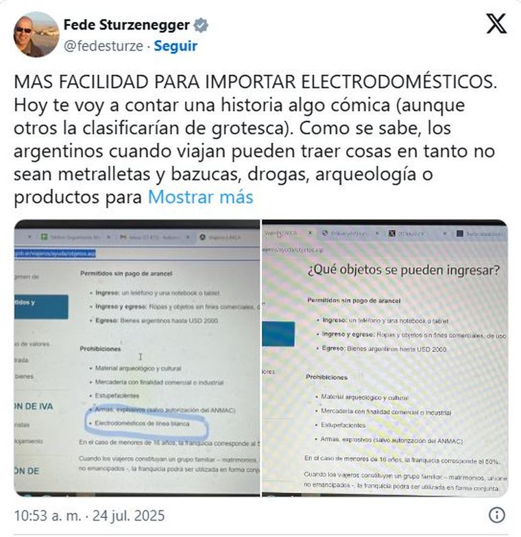"MAS FACILIDAD PARA IMPORTAR ELECTRODOMÉSTICOS. Hoy te voy a contar una historia algo cómica (aunque otros la clasificarían de grotesca). Como se sabe, los argentinos cuando viajan pueden traer cosas en tanto no sean metralletas y bazucas, drogas, arqueología o productos para fines comerciales. Pues he aquí, que entre los prohibidos, -es decir equipados en peligrosidad como las metralletas y un kilo de cocaína- estaban los electrodomésticos de línea blanca", inició Sturzenegger
