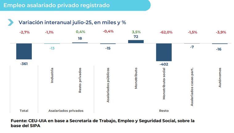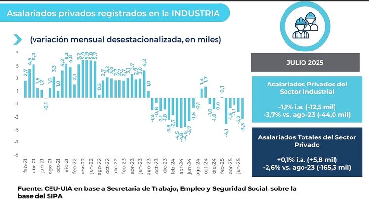 El deterioro de la industria ocurre en un contexto de virtual estancamiento del empleo privado. En julio, el total de asalariados registrados en el sector privado apenas creció 0,1% interanual, con 5.820 nuevos puestos, pero registró una baja mensual del 0,1% desestacionalizada.