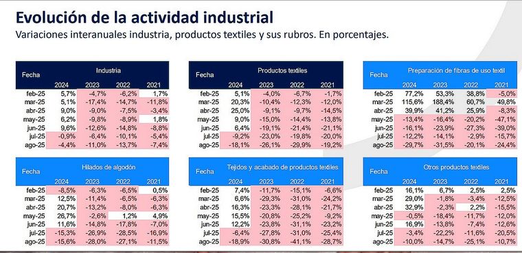 Según FITA, el balance acumulado entre enero y agosto no obstante continuaba en positivo con un crecimiento del 2,2 por ciento, aunque por debajo del avance del total de la industria, que alcanzó 4,4 por ciento. El resultado positivo respondió, fundamentalmente, al impulso de los segmentos de “Otros productos textiles” y de “Tejidos y acabado de productos textiles”, que compensaron parcialmente la debilidad de los demás subrubros.