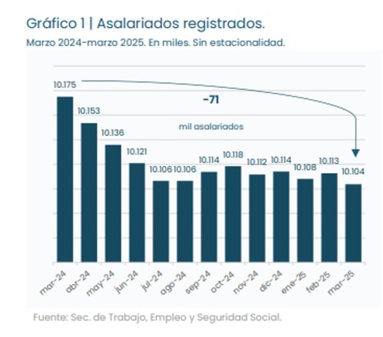 El documento fue elaborado sobre la base de datos provistos por el Sistema Integrado Previsional Argentino (SIPA), y analiza las caídas consecutivas observadas desde septiembre de 2023 hasta julio de 2024, período en el que el empleo asalariado formal total se mantuvo relativamente estancado, alternando algunas mejoras y caídas leves. En marzo de 2025 se registró una caída de 9.000 puestos de trabajo respecto al mes anterior.