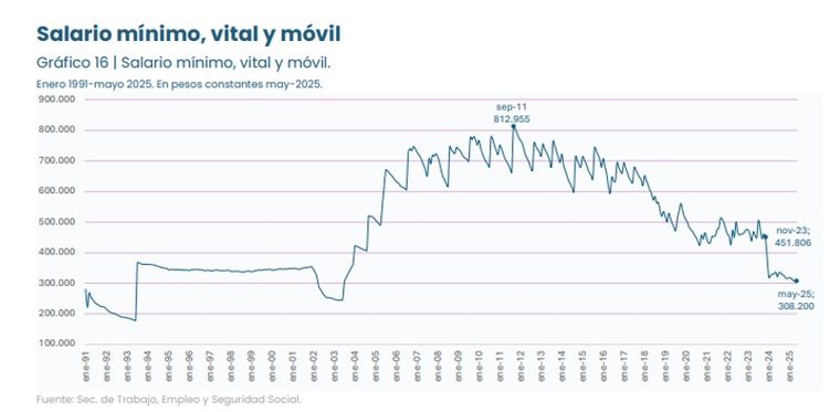 En cuanto a las remuneraciones, entre noviembre de 2023 y mayo de 2025 el salario mínimo real acumuló una caída de 32%, que lo ubica en términos reales de mayo de 2025 en un valor inferior al de 2001, antes del derrumbe de la convertibilidad, de acuerdo al informe del IIEP.