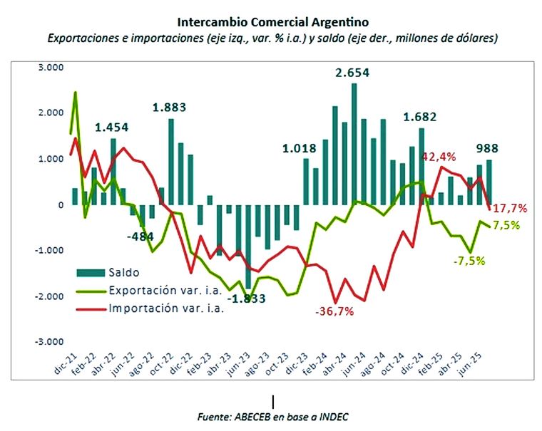 Los precios de las exportaciones crecieron levemente en términos interanuales un 1,3%, mientras que los precios de las importaciones cayeron un 4,1%, resultando en una mejora de los términos de intercambio de 5,6% respecto a julio de 2024. Esto provocó una mejora en el saldo de la balanza comercial de casi $400 millones, según el informe de la consultora ABECEB.