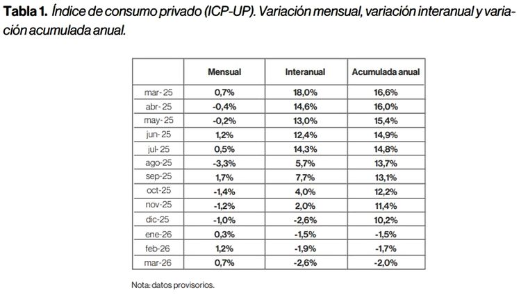 De acuerdo con el informe, el consumo privado creció 0,7% respecto de febrero y acumuló una suba de 2,2% frente a diciembre de 2025. Sin embargo, en la medición interanual el índice mostró una caída del 2,6% con un acumulado para el primer trimestre del 2% en comparación con el mismo período de 2025.