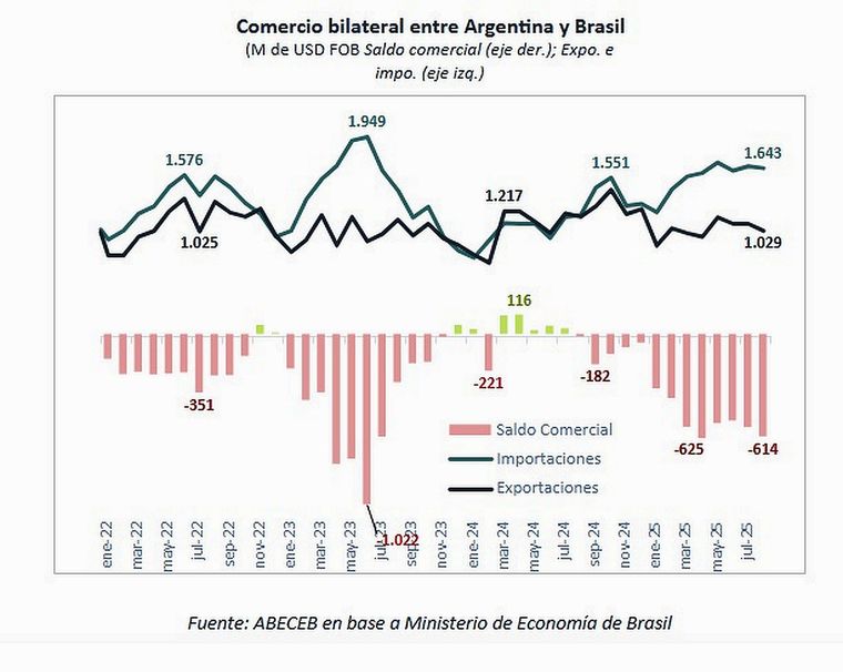 Argentina cerró el mes de agosto con un abultado déficit de US$614 millones en su balanza comercial bilateral con Brasil, una cifra que contrasta fuertemente con los números del mismo mes de 2024, cuando el negativo era sólo de US$14 millones.