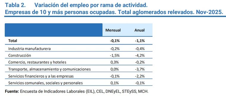 El reporte puntualizó diferencias según la dimensión de las firmas. En las empresas pequeñas (10 a 49 empleados) y las medianas (50 a 199) no se registró variación en noviembre, pero entre las empresas de más de 200 empleados, el empleo volvió a caer (-0,1%), acumulando un año sin crecimiento en este segmento.