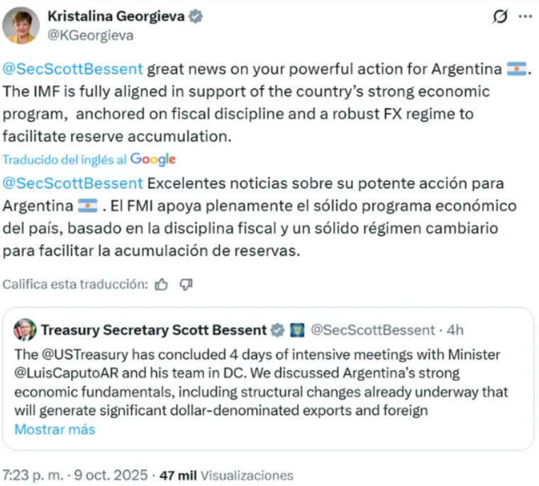 La funcionaria compartió en X la publicación de Bessent que detalla el salvataje y destacó: “Excelentes noticias sobre su potente acción para Argentina”. Hace unos días, Georgieva había informado que se había reunido con el secretario del Tesoro para analizar posibles medidas en torno a la situación económica argentina.