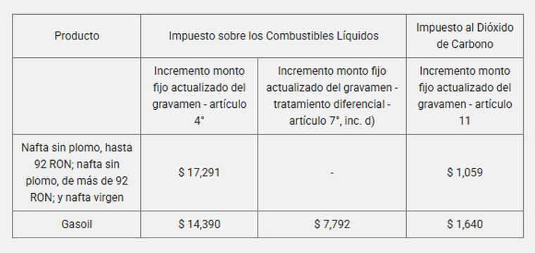 Durante enero de 2026, se aplicará una suba parcial de los impuestos: en el caso de las naftas, el incremento será de $17,291 en el tributo a los combustibles y de $1,059 en el impuesto ambiental. Para el gasoil, el aumento será de $14,390 en el impuesto general, más un adicional de $7,792 en las zonas alcanzadas por el tratamiento diferencial —como la Patagonia— y $1,640 por el impuesto al dióxido de carbono.