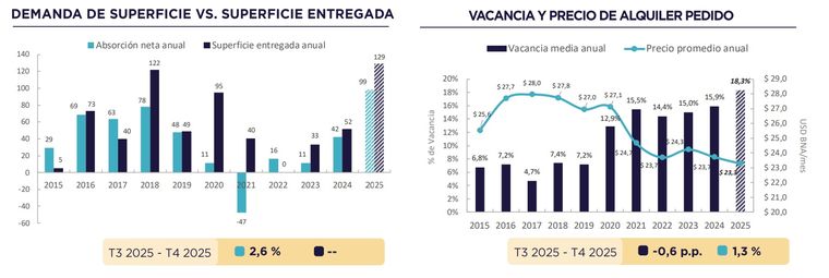 De cara a 2026, el informe anticipa un escenario con un menor ritmo de nuevas entregas y una demanda que se mantiene activa, lo que podría generar una brecha entre las expectativas de ocupación y la oferta disponible. Ignacio Álvarez, coordinador de Investigación de Mercado de Cushman & Wakefield, señaló que si la actividad económica acompaña, la demanda de M2 podría sostenerse y derivar en una reducción de la vacancia, en un contexto donde el stock no se ampliaría durante el año.
