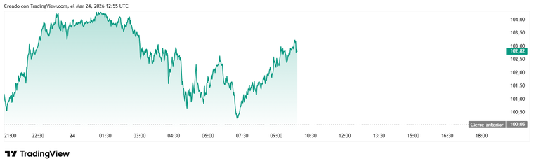 Hacia las 4:45 GMT, durante la sesión asiática, el crudo Brent para entrega en mayo registró una subida del 4,26%, alcanzando los 104,20 dólares. Si bien el ritmo se moderó ligeramente pasadas las 8:00, el barril se mantuvo firme en los 101,7 dólares, consolidando un aumento cercano al 1,8% respecto al cierre previo.