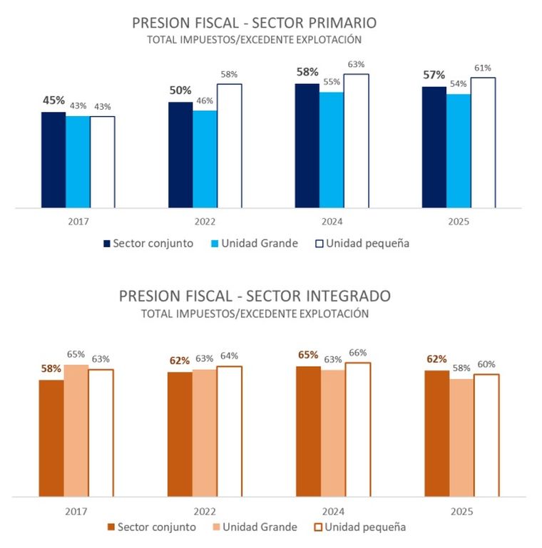 La evolución histórica confirma el agravamiento progresivo de la situación. Desde el primer registro en 2017, la carga impositiva creció sistemáticamente en ambos segmentos. Las fincas pasaron de tributar el 45% al actual 57,1%, experimentando un incremento de 12 puntos porcentuales. Las bodegas pasaron del 58% al 62,4%, acumulando un aumento de 4,4 puntos en el período analizado.