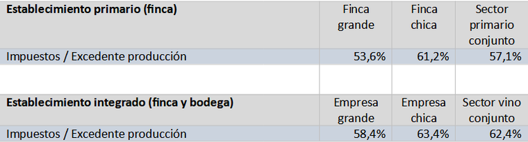 La segmentación por tamaño de empresa revela otra arista problemática del panorama tributario. Los establecimientos de menor escala enfrentan una presión fiscal más intensa que sus competidores de mayor envergadura. Las fincas pequeñas destinan el 61,2% de su excedente al fisco, mientras las grandes lo hacen con el 53,6%. En el segmento bodeguero, las empresas chicas tributan el 63,4% de su resultado y las grandes el 58,4%.