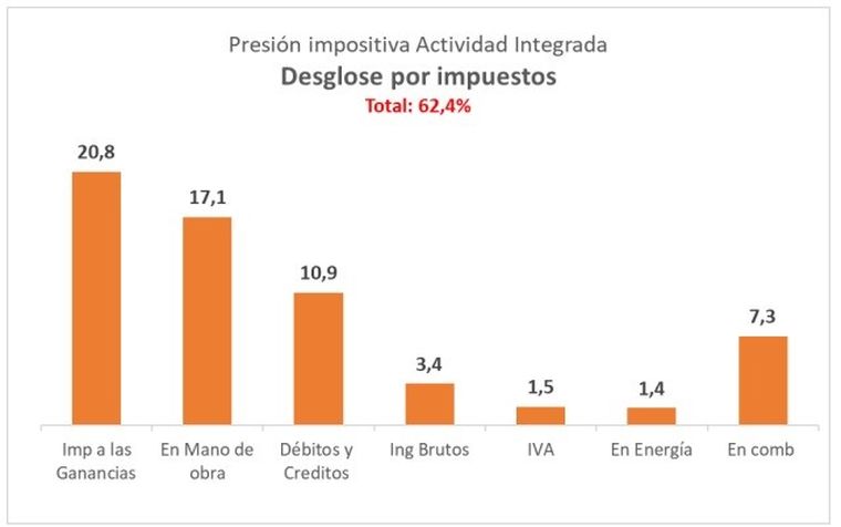 El desglose de los principales componentes tributarios identifica a Ganancias como el gravamen de mayor impacto, representando 20,8 puntos porcentuales del total. Le siguen los impuestos laborales con 17,1 puntos y el tributo a los débitos y créditos bancarios con 10,9 puntos. Ingresos Brutos, único impuesto provincial en el ranking, aporta 3,4 puntos porcentuales.