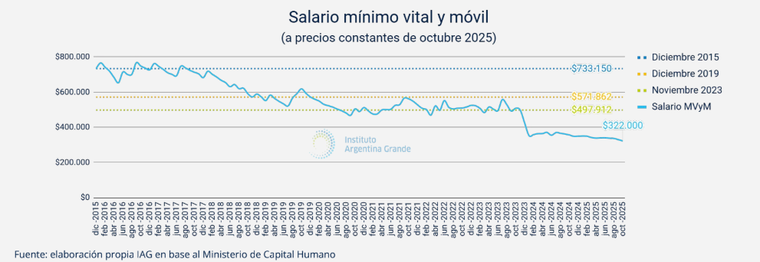 En octubre el salario mínimo fue de $322.000 y para poder recuperar en términos reales los niveles previos a noviembre de 2023 debe incrementar un 54,6%, según estimaciones del Instituto Argentina Grande (IAG).