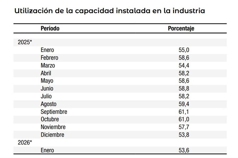 La industria automotriz también mostró una fuerte contracción. En enero operó con apenas el 24% de su capacidad instalada, muy por debajo del 34,8% del mismo mes del año anterior. La caída responde a la menor cantidad de unidades fabricadas por las terminales, en un contexto en el que la producción de vehículos se redujo 30,4% interanual según el IPI manufacturero.