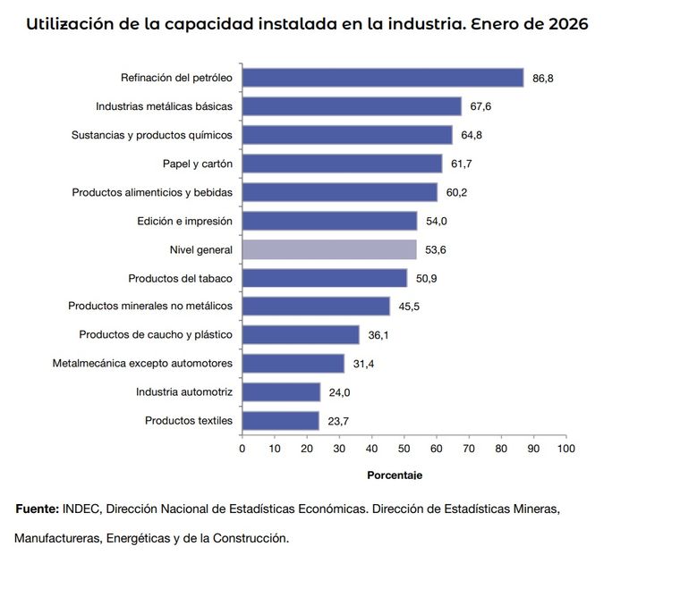 La utilización de la capacidad instalada en la industria argentina volvió a caer en el mes de enero. Se ubicó en 53,6 y estuvo por debajo del 55% registrado en el mismo mes del año pasado, según datos del Indec. De esta forma, ya está cerca de los números que tuvo en lo más profundo de la pandemia cuando tocó un pico del 42% en mayo de 2020, aunque lo recuperó rápidamente para llegar al 53,3% en junio, un número similar al actual.