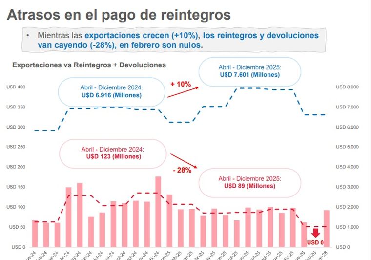 El caso paradigmático fue febrero de 2026 cuando los reintegros fueron literalmente cero. Ante el reclamo de los exportadores al Gobierno en marzo se volvió a abrir la canilla y se reintegró una cifra cercana a los US$100 millones, que según dicen los exportadores "es plata de las empresas que retiene el Estado".
