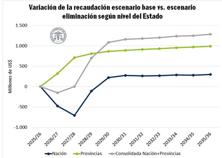 En términos temporales, para la Nación el aumento en la recaudación por otros tributos "genera que a partir del cuarto año desde la eliminación el resultado neto sea positivo", no sólo por expansión de la superficie cultivada sino también por impulso a otros sectores económicos y derrame sobre estas actividades, con su consecuente pago de impuestos.