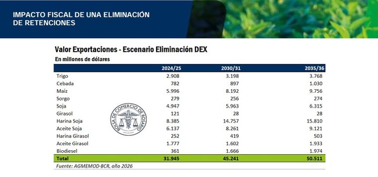 El único año con pérdida neta de recaudación consolidada sería 2027, con un costo de US$ 153 millones por la primera reducción de alícuotas, pero ya a partir de 2028, con la eliminación total la mayor recaudación por vía directa (Ganancias, Débitos y Créditos, Ingresos Brutos y Sellos) y por vía indirecta consecuencia de la mayor actividad económica supera la pérdida de las retenciones, remarcan desde Bolsa de Comercio de Rosario.