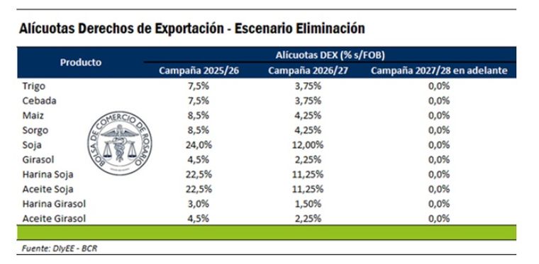 Partiendo como situación base de las alícuotas actuales, el informe estima qué ocurriría con la eliminación gradual de retenciones en dos años.