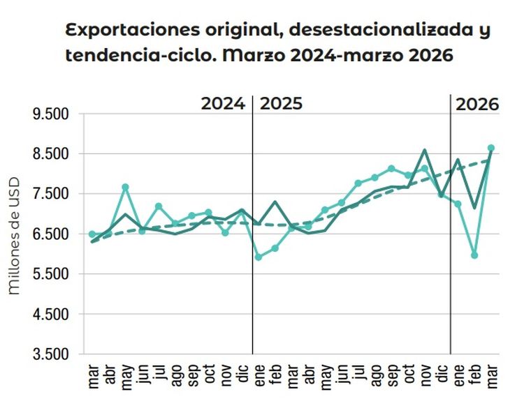 El crecimiento estuvo explicado principalmente por un aumento de 25,3% en las cantidades exportadas, acompañado por una suba de 3,9% en los precios. En términos desestacionalizados, las exportaciones avanzaron 19,8% respecto de febrero, mientras que la tendencia-ciclo mostró una mejora de 1,2%.