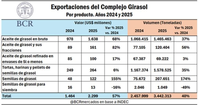 Un informe de la Bolsa de Comercio de Rosario (BCR) destaca que "la producción de girasol alcanzó su máxima expresión en este siglo en la cosecha 2024/25", gracias a elevados volúmenes y buenos precios. Así, el complejo girasol argentino consolidó un 2025 con un desempeño exportador récord.