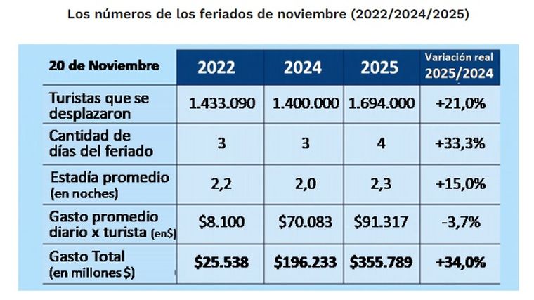 Con este último feriado, el número de turistas que viajaron entre enero y noviembre asciende a 11.964.940 personas. En total, los siete fines de semana largos de 2025 generaron un movimiento económico estimado en $2.722.208 millones, equivalentes a 1.944 millones de dólares. CAME indicó que el efecto sobre las economías regionales fue significativo, especialmente para miles de pymes ligadas a la actividad turística.