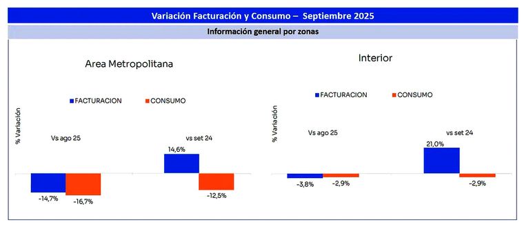 El informe muestra además una marcada diferencia territorial. En el Área Metropolitana de Buenos Aires (AMBA) el consumo se desplomó 16,7% en septiembre, con una caída de facturación del 14,7% respecto de agosto. En el interior del país el descenso fue más moderado: el consumo bajó 2,9% y la facturación 3,8%.