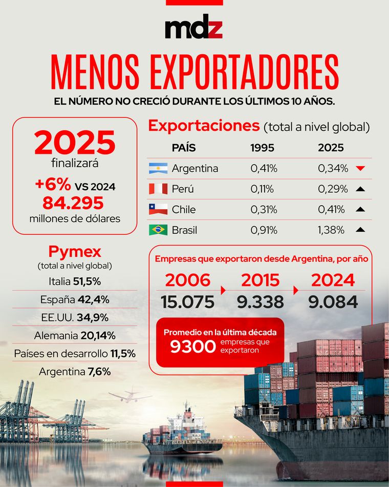 Foto: EFEPocas veces un buen dato económico puede esconder problemas subterráneos tan profundos y estructurales como en el caso de las exportaciones. Se estima que este año las exportaciones terminarán casi 6% por encima de 2024, totalizando 84.295 millones de dólares, sin embargo, la matriz exportadora argentina permite observar que hay una tendencia a la primarización.