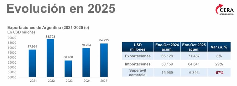 Desde la Cámara de Exportadores estiman que el año cerrará arriba de US$84.000 millones pero denuncia una creciente primarización de las exportaciones.