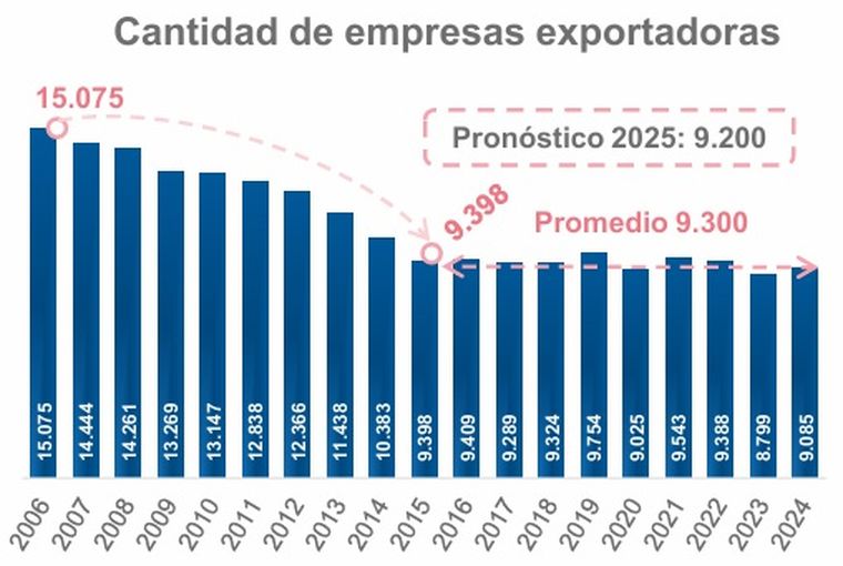 Uno de los aspectos más complejos que advierten los analistas de CERA es el estancamiento y primarización que se observa en las exportaciones. Mientras en 2006 hubo 15.075 empresas exportaron en Argentina, ese número comenzó a decrecer hasta llegar a 9.338 en 2015 y a partir de allí se estancó en esos niveles, para anotar 9.084 en 2024, totalizando un promedio de 9300 en la última década.