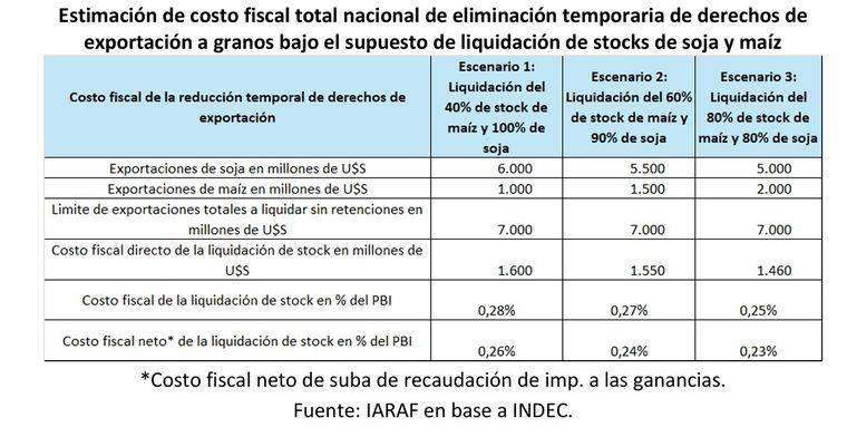 En este sentido, menciona el trabajo, "se suponen tres escenarios: 1) 40% de liquidación del stock de maíz y 100% del stock de soja, 2) 60% de maíz y 90% de soja y el 3) 80% del stock de maíz y 80% del de soja. En términos del PBI, el costo directo va desde 0,25% del PBI hasta 0,28% del PBI". Sin embargo, "para el Gobierno Nacional, si se considera el aumento posible de recaudación del impuesto a las ganancias y su distribución luego de coparticipación a Nación (aproximadamente un 8% de la reducción de derechos de exportación), se reduce el costo fiscal directo a 0,26% del PBI en el escenario 1, a 0,24% en el escenario 2 y a 0,23% en el escenario 3", con lo que "Obviamente hay un desfasaje, teniendo en cuenta que el impuesto a las ganancias se tributa al año siguiente".