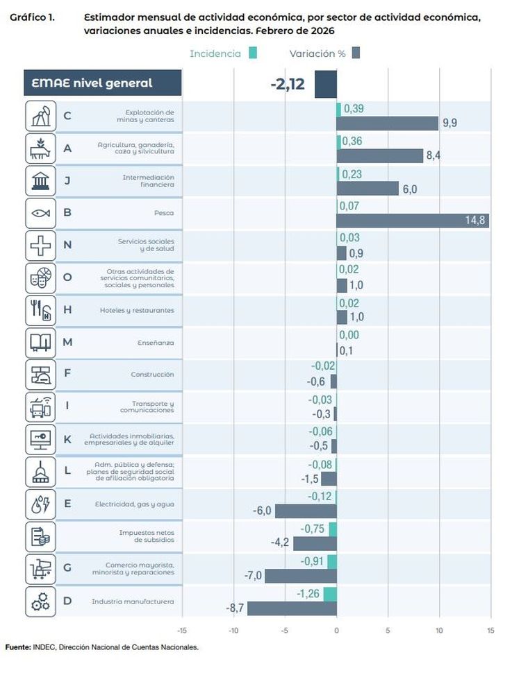 Con relación a igual mes de 2025, ocho de los sectores de actividad que conforman el EMAE registraron subas en febrero. Se destacaron Pesca (14,8%) y Explotación de minas y canteras (9,9%). La actividad de Explotación de minas y canteras (9,9%) fue a su vez la de mayor incidencia positiva en la variación interanual del EMAE, seguida de Agricultura, ganadería, caza y silvicultura (8,4%).