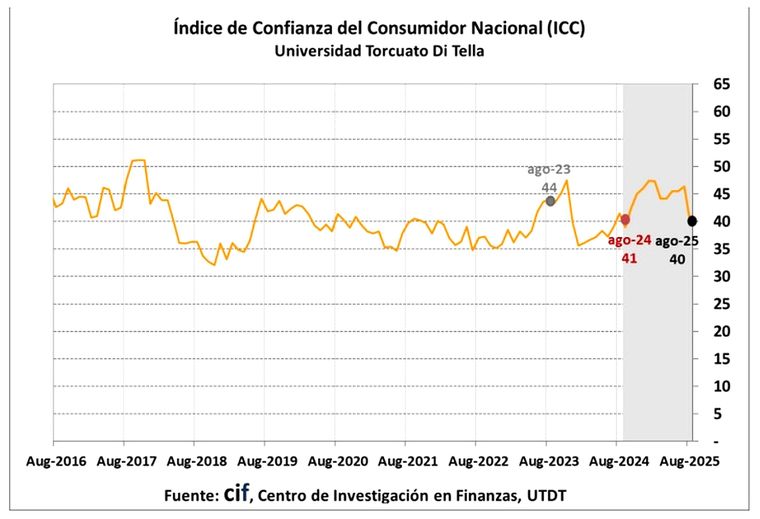 El Índice de Confianza del Consumidor (ICC) realizado por el Centro de Investigación en Finanzas de la Universidad di Tella en la primera quincena de agosto se ubicó en 39,94 puntos, lo que representa una caída del 13,87% respecto del mismo periodo de julio, cuando había alcanzado 46,37.