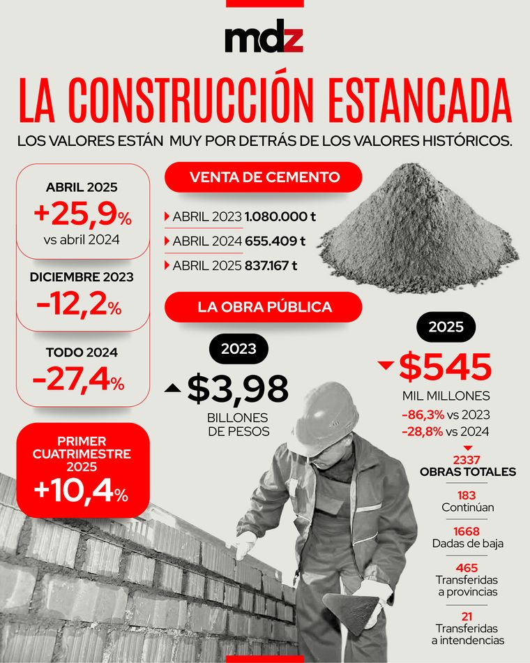 Para ejemplificar vale tomar uno de los indicadores centrales, los despachos de cemento. En abril de 2023 se vendieron 1.080.000 toneladas, en abril de 2024 se despacharon 655.409 toneladas y en abril de 2025 la venta llegó a 837.167 toneladas, aun lejos de lo que se perdió en 2024, pero con una fuerte mejoría.