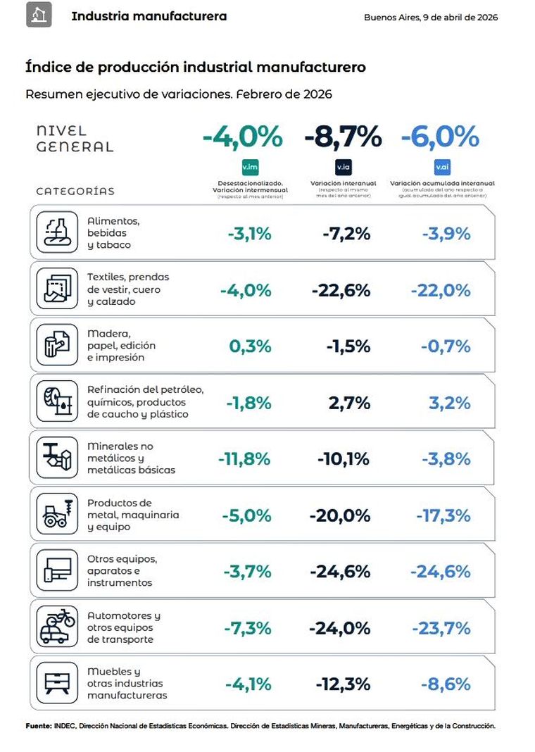 El deterioro de la actividad industrial fue generalizado: catorce de las dieciséis ramas relevadas registraron caídas interanuales. Entre los sectores con mayores retrocesos se ubicaron maquinaria y equipo (-29,4%), vehículos automotores y autopartes (-24,6%), productos textiles (-33,2%) y prendas de vestir, cuero y calzado (-18,2%). También se verificaron bajas en alimentos y bebidas (-6,9%), productos de caucho y plástico (-15,7%) e industrias metálicas básicas (-12,5%).