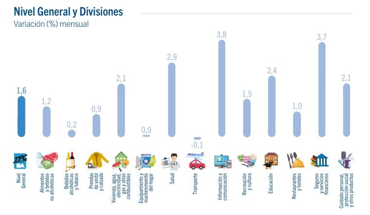 Otros segmentos con subas por encima del 2% son Educación (2,4%), Vivienda, agua, electricidad, gas y otros combustibles (2,1%), Cuidado personal, protección social y otros productos (2,1%).
