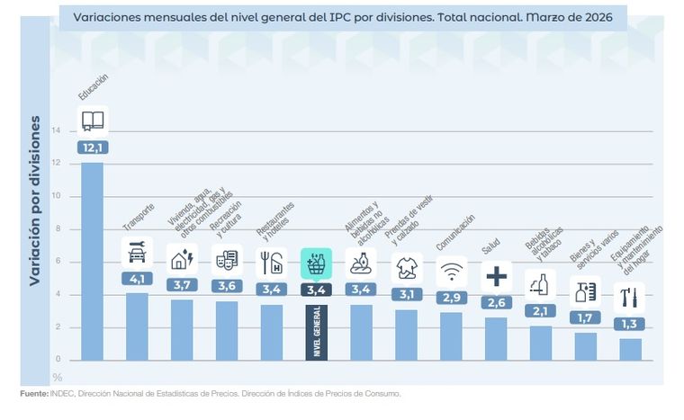 La división de mayor aumento en el mes fue Educación (12,1%): como todos los años, esta suba coincide con el inicio de las clases. La segunda división con mayor aumento fue Transporte (4,1%) debido a los combustibles, el transporte público y los pasajes aéreos.