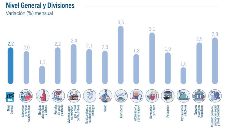 La suba del mes estuvo impulsada principalmente por las divisiones Vivienda, agua, electricidad, gas y otros combustibles, Transporte, Alimentos y bebidas no alcohólicas, Salud y Recreación y cultura, que en conjunto explicaron el 70,1% del aumento del nivel general.