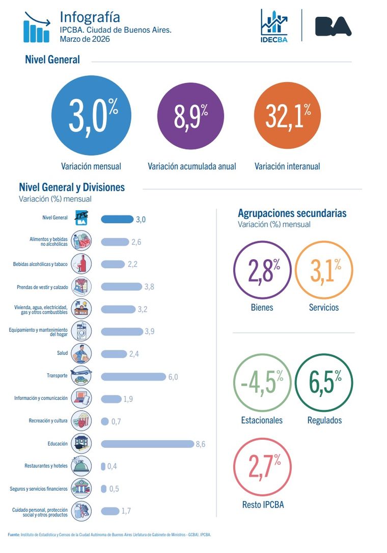 NAEl Índice de Precios al Consumidor de la Ciudad de Buenos Aires (IPCBA) registró en marzo un incremento del 3%, con lo que acumuló una suba del 8,9% en los primeros tres meses de 2026. En términos interanuales, la inflación porteña se ubicó en 32,1%, con una leve desaceleración de 0,3 puntos porcentuales respecto de febrero.