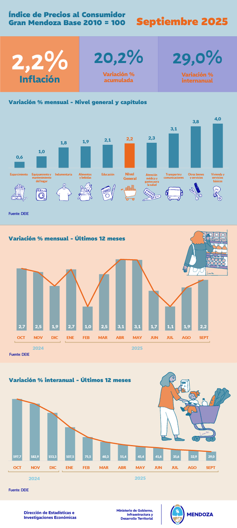 MILAGROS LOSTES - MDZEste martes 14 de octubre, la Dirección de Estadísticas e Investigaciones Económicas (DEIE) dio a conocer un nuevo Índice de Precios al Consumidor (IPC), correspondiente a septiembre de 2025 en Mendoza. La inflación en el octavo mes del año fue de 2,2%.
