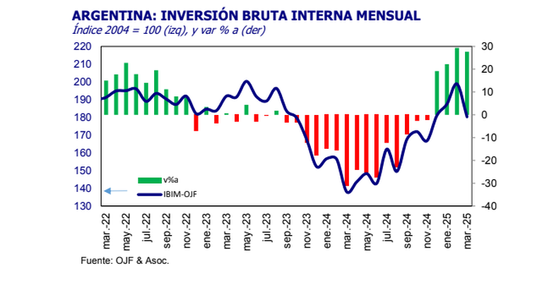 GobiernoAunque la inversión real tuvo en marzo un fuerte incremento internual del 27,7%, medido en términos de volumen físico, sin contar el efecto de la inflación, según el último informe IBIM de OJF (Ferreres), en la comparación contra el mes de febrero se notó una fuerte baja del 9%.